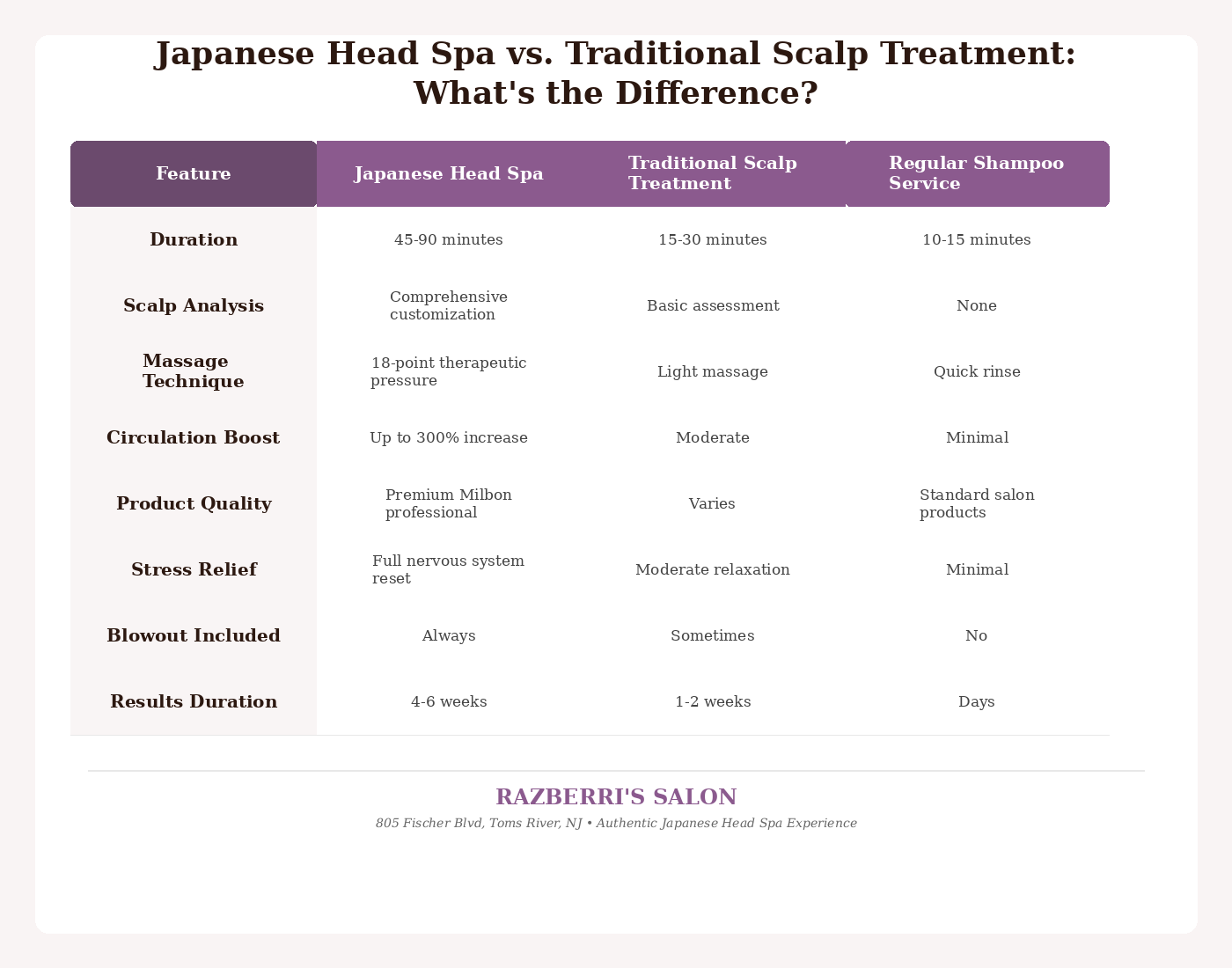 At Razberris Salon in Toms River, NJ, Japanese head spa treatments range from $125 to $225 depending on the service level. All treatments include premium Milbon products, therapeutic massage, and a professional blowout. The Reawaken Signature (45 min) is $125, Luxury Treatment (60 min) is $175, and Gold Standard (90 min) is $225.